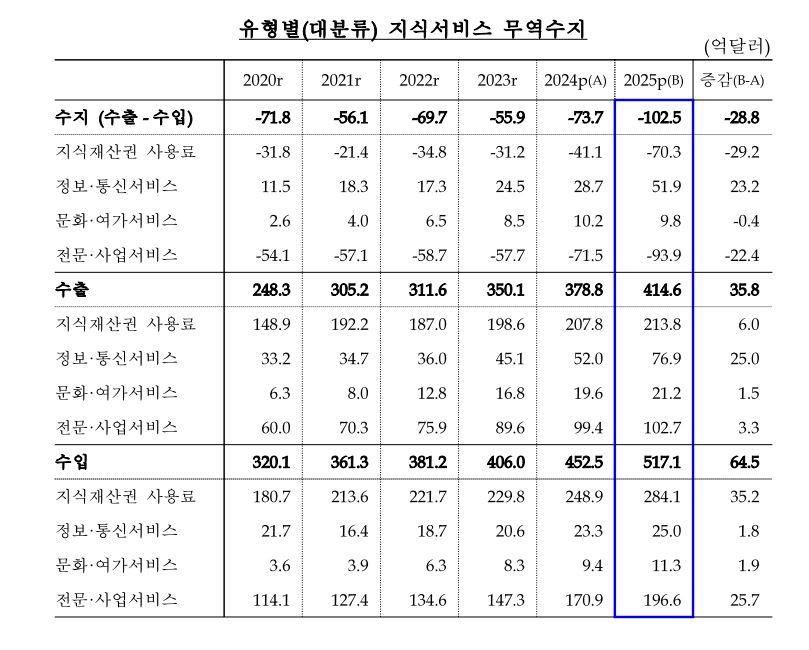 수출 414억·수입 517억달러 … 적자 102억달러로 확대정보통신 51억·문화 9.8억 흑자, K콘텐츠 성장 지속R&D·특허 사용료 증가 … 전문서비스 93억달러 적자대기업 -67억달러 적자 주도 … “첨단산업 투자 영향”