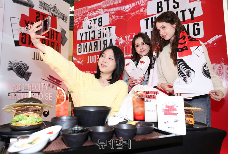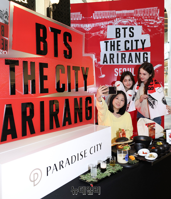 파라다이스시티가 20일 오전 인천 중구 파라다이스시티 플라자에서 방탄소년단 정규 5집 '아리랑(ARIRANG)' 발매 기념 숙박, 미식, 엔터테인먼트 콘텐츠를 선보이고 있다.파라다이스시티는 방탄소년단 컴백을 기념하는 한정판 굿즈 5종을 특별 제작했다. 리조트 내 주요 다이닝 업장들은 방탄소년단의 활동에서 영감을 얻은 메뉴 '블랙 버거' 주류 메뉴 '다이너마이트 샷 플라이트' 등 다양한 F&B 신메뉴를 선보인다.대형 실내 광장 플라자에는 'BTS THE CITY ARIRANG SEOUL' 테마 포토존을 설치해 방문객 누구나 자유롭게 촬영하고 체험할 수 있도록 운영한다. 4월 19일까지 한 달간 선보인다.