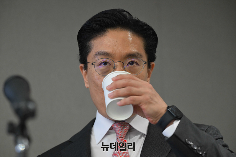 전인석 삼천당제약 대표가 6일 오후 서울 서초구 삼천당제약 본사에서 열린 기자간담회에서 물을 마시고 있다.
