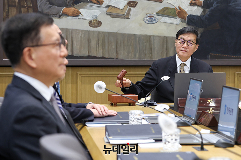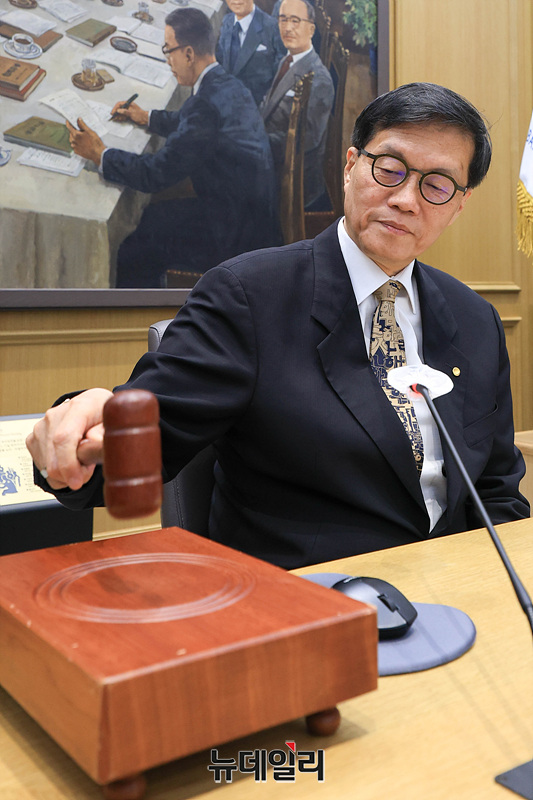 이창용 한국은행 총재가 10일 오전 서울 중구 한국은행 본관에서 열린 금융통화위원회 본회의에서 의사봉을 두드리고 있다. (사진=공동취재단)