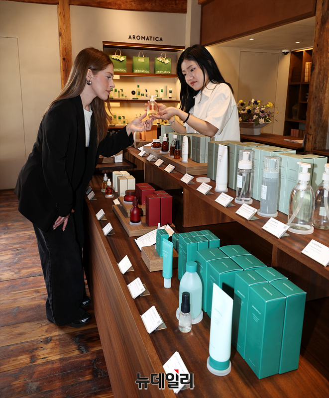 아로마테라피 기반 스칼프&스킨케어 브랜드 아로마티카(대표 김영균, 이준호)가 17일 오전 서울 종로구에서 두 번째 플래그십 스토어 '아로마티카 북촌'을 선보이고 있다.'아로마티카 북촌'에서는 다양한 에센셜오일과 제품을 직접 체험할 수 있다. 공간은 전통의 단순 재현을 넘어, 한옥 구조를 모티프로 향약 정신을 현대적으로 풀어내 브랜드 철학과 경험이 유기적으로 연결되도록 구성됐다.입구의 '누마루'에는 향약의 역사와 천연 에센셜오일의 향을 체험할 수 있으며, 23종의 허브 원물과 오일을 함께 전시해 아로마테라피의 본질이 식물에 있음을 직관적으로 전달한다. '대청'에는 맞춤형 두피 진단 기반 스칼프 케어를, '내실'에서는 피부 본연의 균형 회복을 돕는 스킨 케어를 제공한다. 북촌 전경을 조망할 수 있는 '사랑채'에서는 개인 맞춤형 아로마테라피 제품을 제작하는 클래스가 운영된다. 지하 행랑채는 ESG관으로 조성돼 아로마티카의 친환경 제품 방향성을 소개한다.