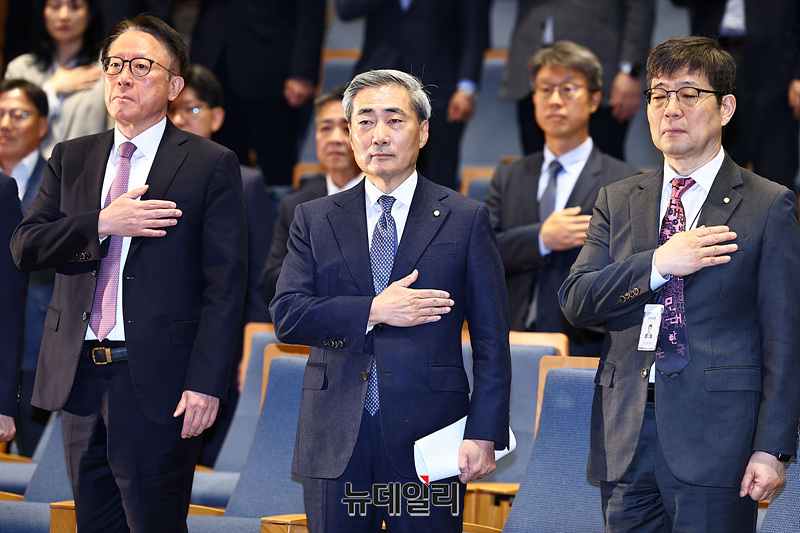 신현송 신임 한국은행 총재가 21일 오전 서울 중구 한국은행에서 열린 취임식에서 국기에 대한 경례를 하고 있다.