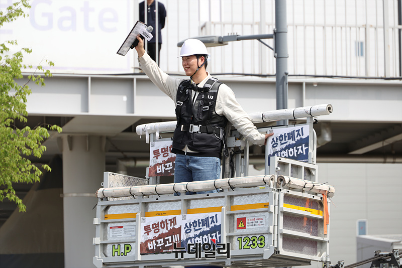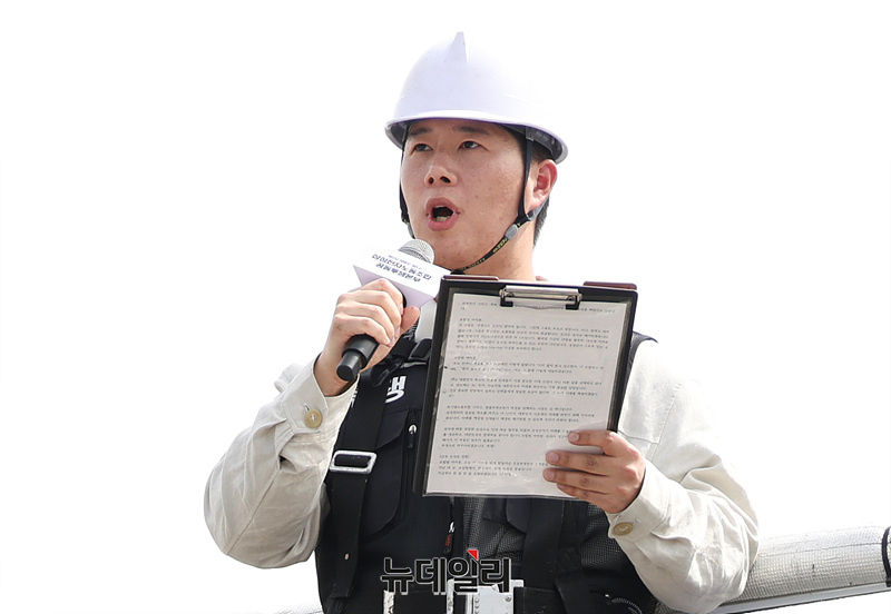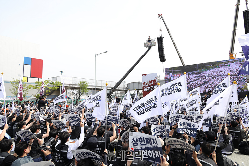 최승호 초기업노동조합 삼성전자 지부 위원장이 23일 오후 경기 평택시 삼성전자 평택캠퍼스 앞에서 대규모 투쟁 결의대회에서 투쟁사를 하고 있다.노조는 성과급 산정 기준의 전면적인 개편을 촉구했다. 사측은 업계 최상위 수준의 보상을 유지하고 있다는 점과 반도체 업황의 실적 변동성 등을 고려해야 한다는 입장을 고수하고 있다.이번 집회 이후에도 합의점을 찾지 못할 경우 5월 21일부터 6월 7일까지 총파업에 돌입할 계획이다. (경기 평택=서성진 기자)