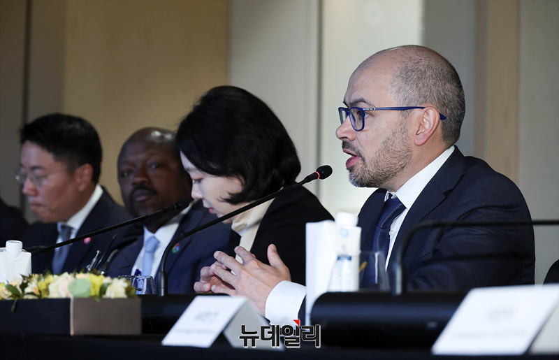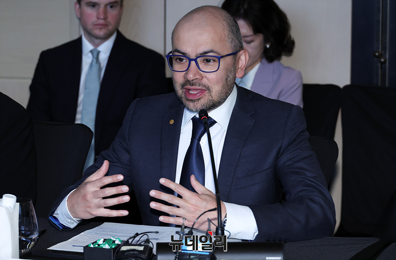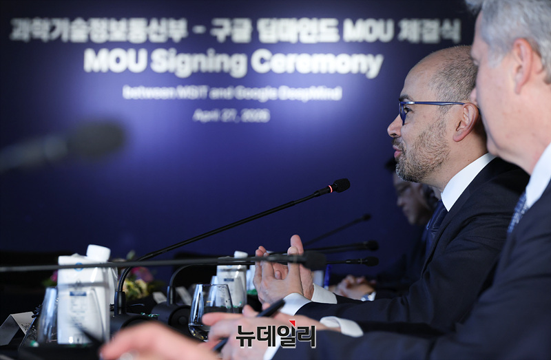 데미스 하사비스(Demis Hassabis) 구글 딥 마인드 CEO가 27일 오후 서울 종로구 포시즌스호텔에서 열린 '과기정통부-구글 딥마인드 MOU 체결식'에서 인사말을 하고 있다.