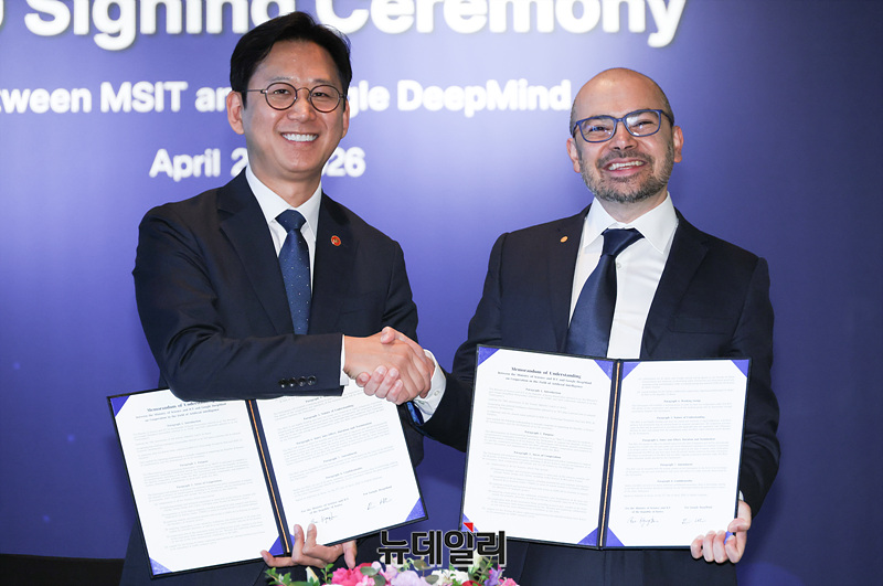 배경훈 부총리 겸 과학기술정보통신부 장관과 데미스 하사비스(Demis Hassabis) 구글 딥 마인드 CEO가 27일 오후 서울 종로구 포시즌스호텔에서 열린 '과기정통부-구글 딥마인드 MOU 체결식'에서 기념촬영을 하고 있다.