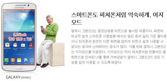 갤럭시 그랜드2는 5.25인치의 큰 화면이 장점이다. 스마트폰보다 일반 피쳐폰에 친숙한 중장년층 사용자들에게 대형 스크린과 맞춤형 UI를 통해 보다 쉽게 이용할 수 있도록 구성됐다. 역시 DMB 기능이 있어 웹서핑 보다 TV가 익숙한 부모님에게는 보다 큰 화면으로 이용할 수 있다.