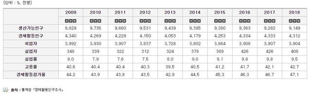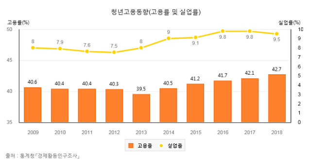 최악의 청년고용률을 기록했던 2013년(39.5%) 청년 실업률은 8%였다. 그러던 수치가 청년고용률 42.7%로 오른 2018년 청년실업률은 9.5%로 치솟았다.