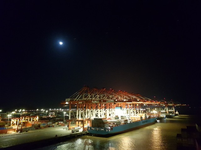 16일 오후 8시 20분(현지시간), 드디어 현대리스펙트호가 중국 상해 양산터미널에 다다랐다. 칠흑같은 어둠 속에 갇힌 선교에는 긴장감이 감돌았지만, 조타등의 미세한 불빛으로 배의 방향을 확인하는 선장의 눈은 반짝이고 있었다. 이곳에서도 마찬가지로 도선사가 승선해 선박의 입항을 돕는다. 보통 출항보다 입항할 때가 더욱 까다롭다고 한다. 상해의 경우 해무도 끼고, 어선도 많아 더욱 그렇다.