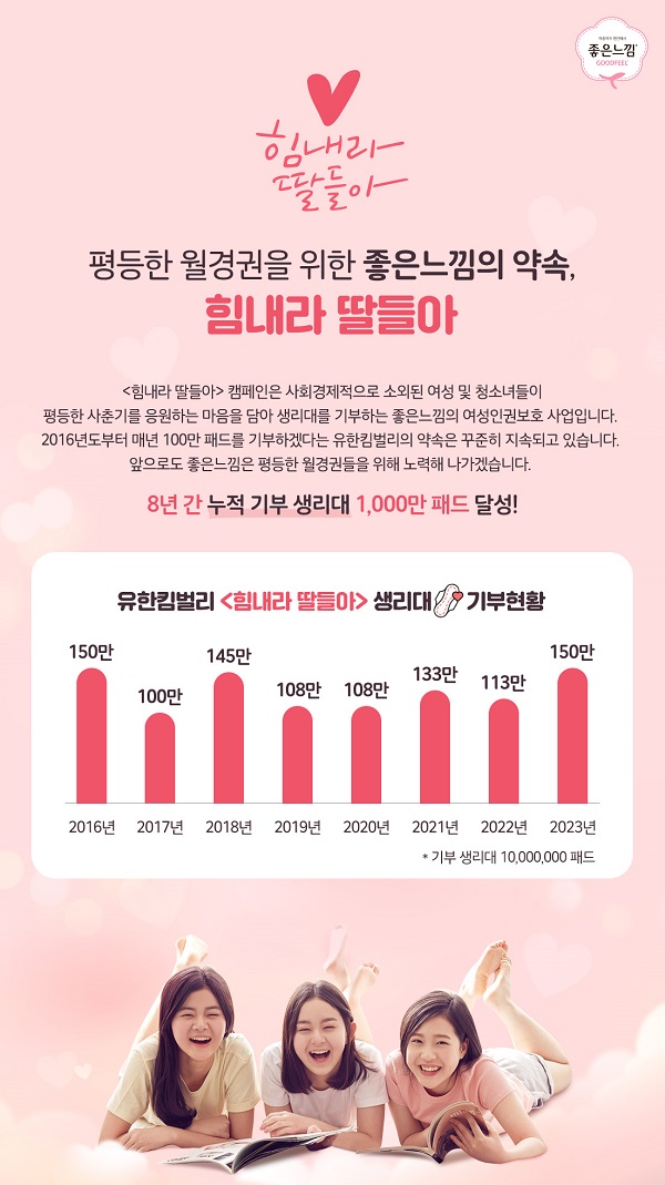 유한킴벌리 여성용품 브랜드 좋은느낌은 지난 2016년 경제적인 이유로 월경에 불편함을 겪는 여성청소년들을 위해 100만 패드의 생리대를 기부하기로 결정하고, ‘한국여성재단’, ‘네이버 해피빈’과 함께 취약계층을 중심으로 생리대를 지원해 왔다. 오는 28일 세계월경의 날 이후 예정되어 있는 기부가 실행되면, 누적 기부 수량은 8년만에 1000만 패드를 넘어서게 된다.