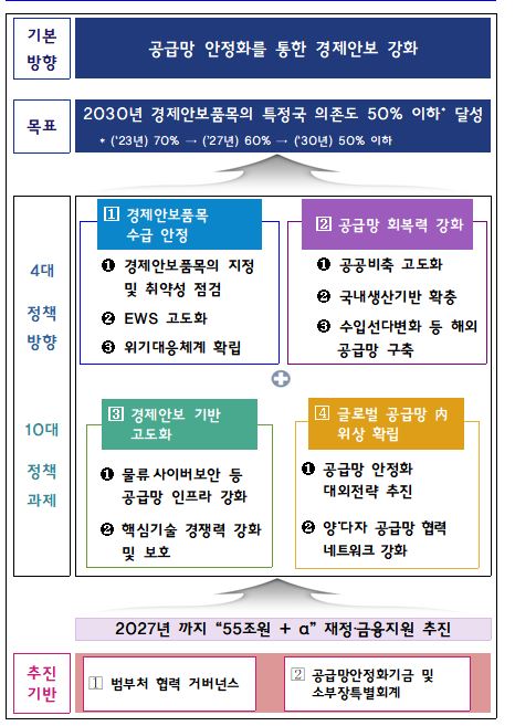 정부가 공급망 안정화에 2027년까지 55조원 이상의 재정·금융지원을 추진한다. 이를 통해 현재 70% 수준인 경제안보품목의 특정국 의존도를 2030년까지 50% 이하로 낮출 방침이다.