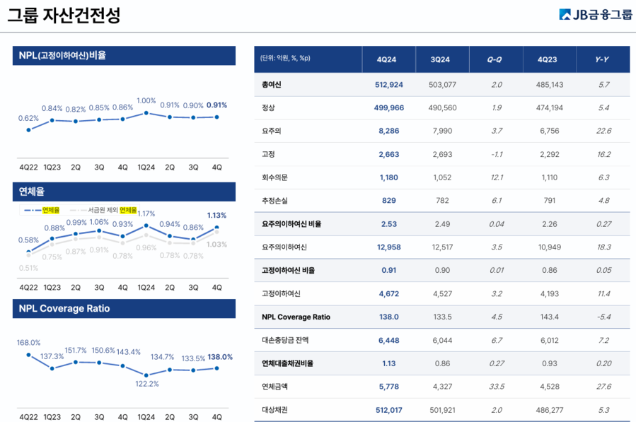 JB금융의 연체율은 지난해 말 1.13%로 전분기(0.86%) 대비 0.27%포인트 늘었다. 전년 동기와 비교해도 0.2%포인트 늘었다.